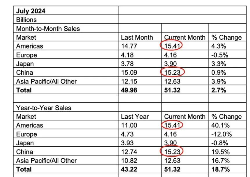 仔細(xì)分析具體數(shù)據(jù),環(huán)比上一個(gè)月,美國(guó)增長(zhǎng)了4.3%,而中國(guó)只增長(zhǎng)了0.9%;同比去年,美國(guó)增長(zhǎng)了40.1%,而中國(guó)只增長(zhǎng)了19.5%,這一對(duì)比凸顯了美國(guó)在近期半導(dǎo)體銷售領(lǐng)域內(nèi)的顯著反彈力和市場(chǎng)策略的有效性。此外,值得注意的是,歐洲市場(chǎng)在環(huán)比層面上呈現(xiàn)出下滑趨勢(shì),同時(shí),歐洲與日本在同比表現(xiàn)上亦遭遇了負(fù)增長(zhǎng),這表明該區(qū)域可能正面臨供應(yīng)鏈挑戰(zhàn)、需求疲軟或技術(shù)創(chuàng)新周期的調(diào)整壓力,與美中市場(chǎng)的積極走勢(shì)形成了鮮明對(duì)比。