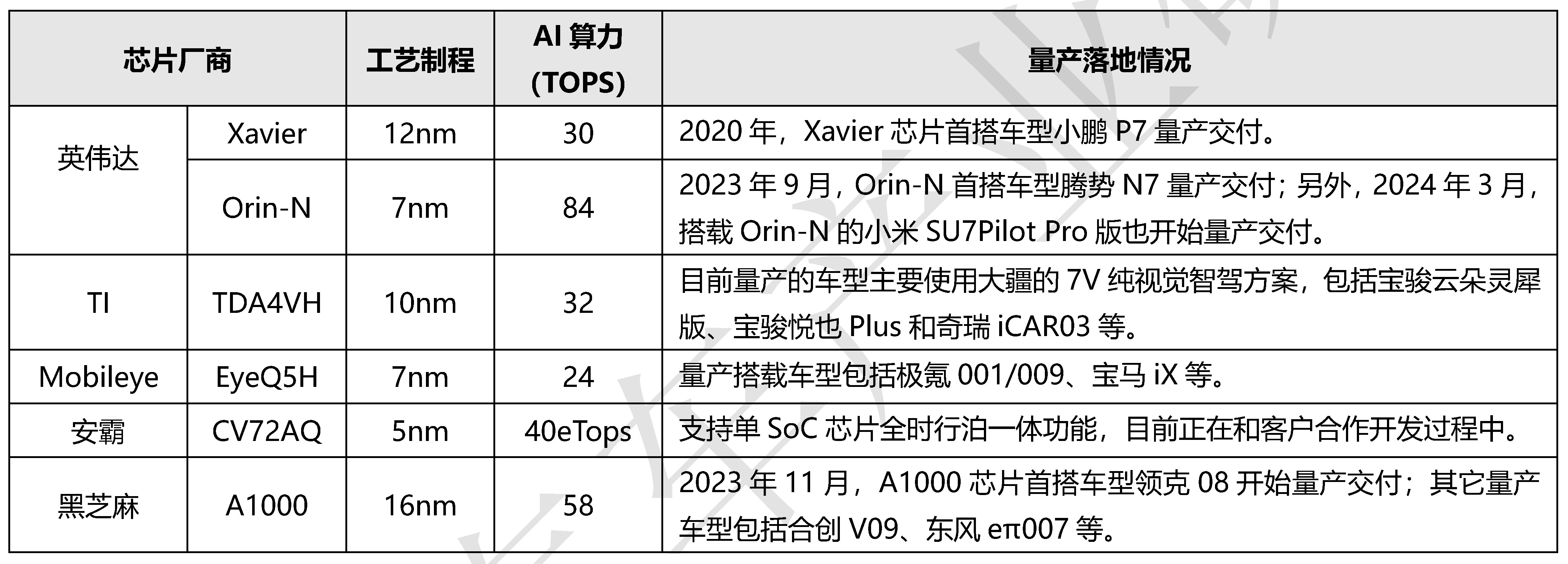 另外,在智能駕駛功能配置上,不同市場定位車型的智能駕駛方案對主控SoC芯片也存在不同層級的需求。目前,參考不同級別智駕方案對主控SoC芯片在AI算力需求上的不同,智駕SoC芯片可大致分為三種類型:小算力SoC芯片(2.5~20TOPS)、中算力SoC芯片(20~80TOPS)和大算力SoC芯片(≥100TOPS)。