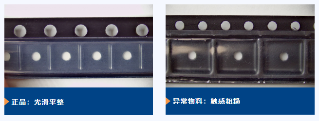 6、編帶造假一些貼片類元器件需要編帶包裝,不良商家會將翻新后的元器件重新編帶,模擬正品的包裝形式,但造假的編帶在材質(zhì)、尺寸、間距等方面可能與正品存在差異,而且元器件在編帶中的固定也有可能不夠牢固。