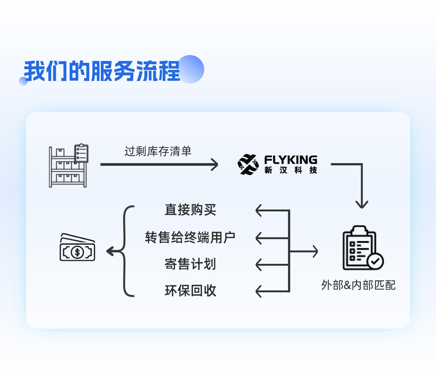 在服務(wù)模式上,新漢科技始終強(qiáng)調(diào)系統(tǒng)化與高效性。客戶只需將過(guò)剩庫(kù)存清單交付給我們,我們能應(yīng)用智能數(shù)據(jù)系統(tǒng),對(duì)過(guò)剩庫(kù)存進(jìn)行智能分類和高效匹配,通過(guò)匹配上下游供應(yīng)鏈需求為客戶提供購(gòu)買、轉(zhuǎn)售、寄售、環(huán)?;厥盏确桨?,幫助客戶轉(zhuǎn)虧為盈。
