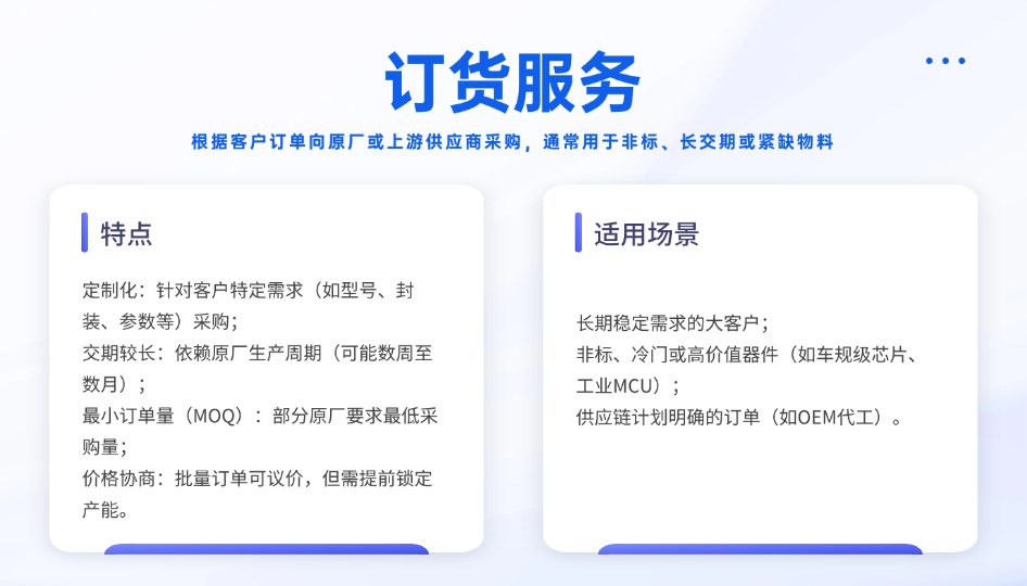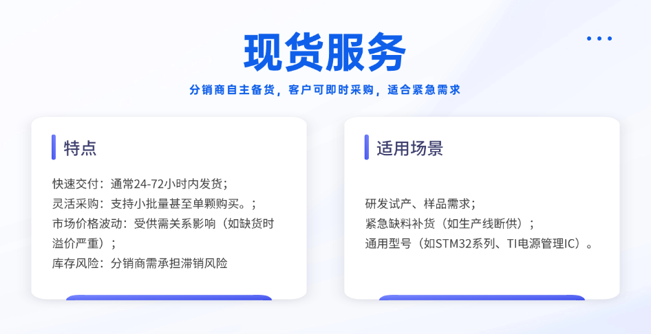 現(xiàn)貨服務(wù)是半導(dǎo)體分銷商提升競(jìng)爭(zhēng)力的重要手段。在市場(chǎng)需求瞬息萬變的當(dāng)下,擁有充足的現(xiàn)貨庫存能夠快速響應(yīng)客戶的緊急需求,為客戶節(jié)省時(shí)間成本,提升客戶滿意度。